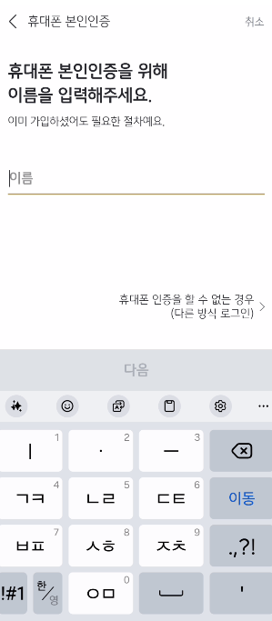 앱을 실행한 후 회원가입을 진행합니다. 본인 인증을 위해 필요한 정보를 입력하고 인증서를 통해 본인 확인을 합니다.