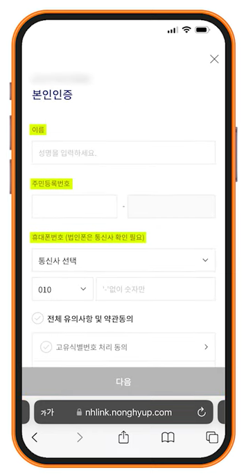 1. 휴대폰 본인 확인 : 본인 인증을 위해 휴대폰 번호를 입력하고 인증번호를 받아 입력합니다.
