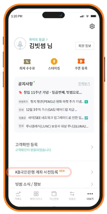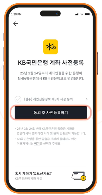 빗썸에서는 2025년 3월 24일 11시부터 KB국민은행에 대한 사전등록을 미진행한 고객에 대해서는 서비스 이용에 제한이 되오니 아래 글을 잘 읽고 따라 하시기 바랍니다.