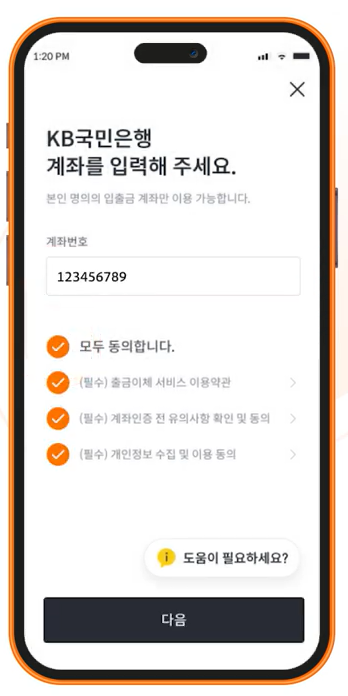 5. KB국민은행 계좌 입력 후 동의 사항을 모두 체크합니다.