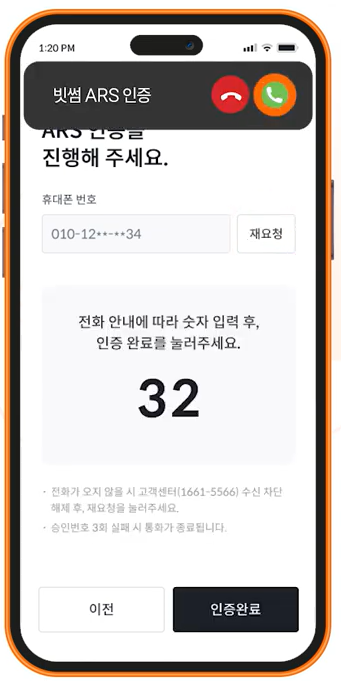 ARS 인증이 인증번호 입력 이후 인증완료를 누르면 인증이 완료됩니다.