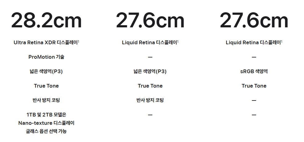 디스플레이는 드로잉에 직접적인 영향을 미치는 요소입니다. 세 모델의 디스플레이를 비교해 보겠습니다.