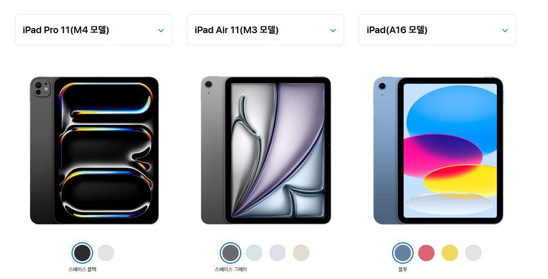 애플은 2025년 라인업에서 프로(M4), 에어(M3), 기본 아이패드(A16)를 세공하며 각각 다른 가격대와 성능을 겨냥하고 있습니다.