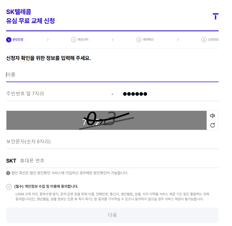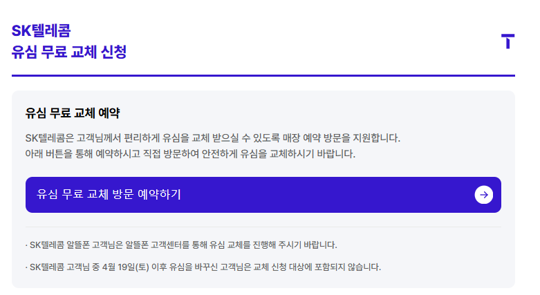 아래 링크를 통해 SK텔레콤 유심 무료 교체 신청 페이지에 접속합니다.